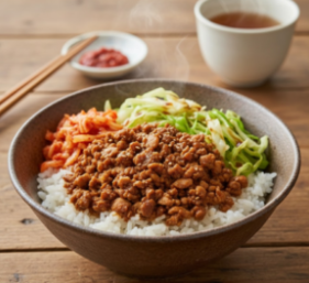- 内容: ご飯の上に、キャベツ(ザク切りを軽くレンジでチン)と、初日に作った「肉そぼろ」を乗せます。